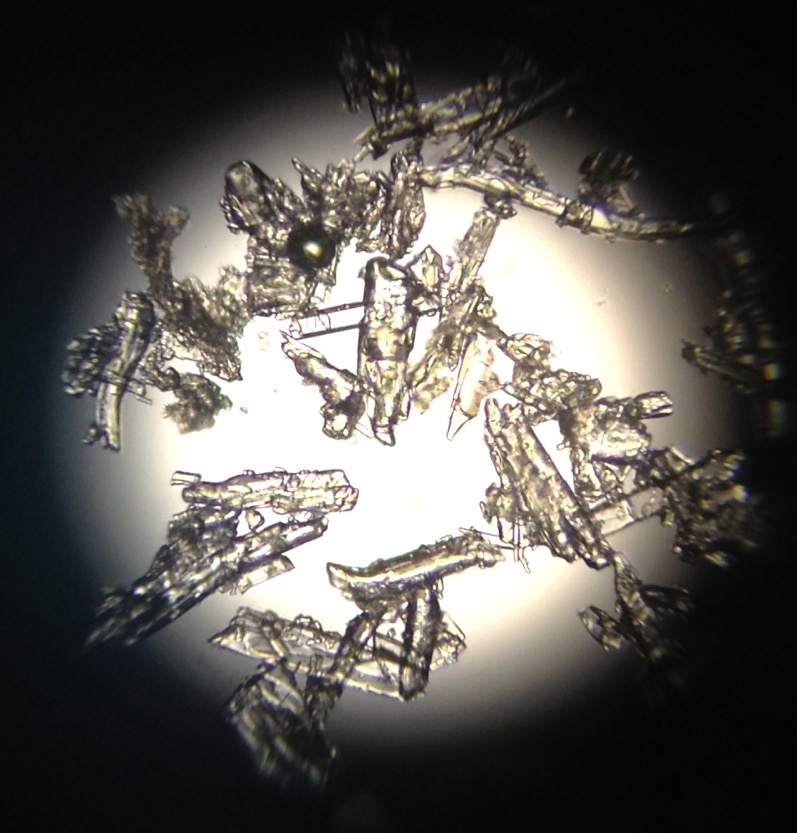 Upon cooling it developed small needles... When you touch it, it feels like hair, even stings a little.