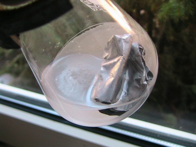 Today, I took out what has remained of the foil, and poured off the solution. On the flask, a white substance had formed. It did not dissolve in 10%