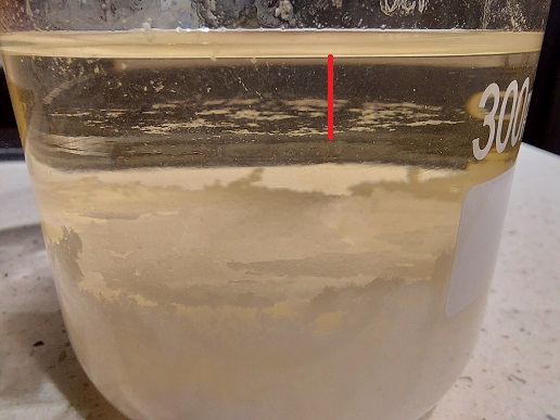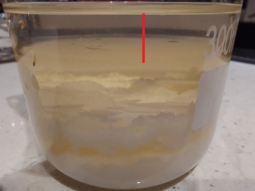 White flaky ppt is formed almost immediately. An organic layer (MEK+ketazine?) floats on top of the aqueous/sulfuric acid layer (red line) ...