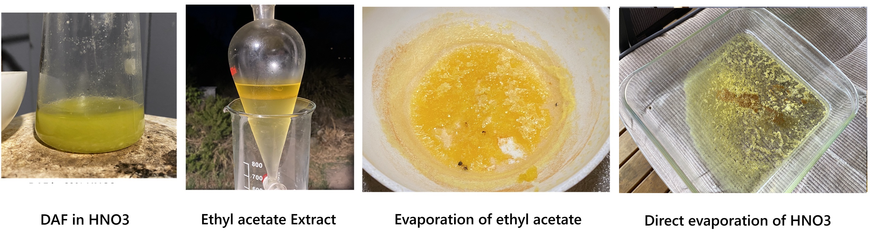 I tried again, 5 g DAF was stirred in room temp. 68% HNO3 for 2-3 hrs until it dissolved, then either evaporated out directly or poured into 200mL