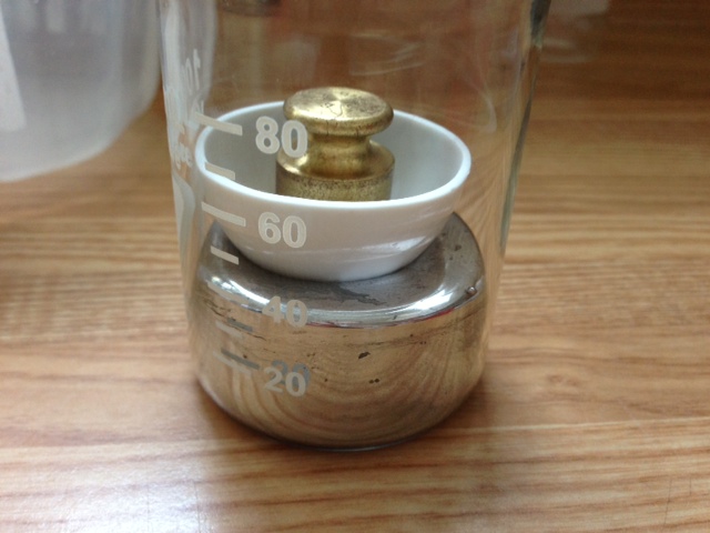 So long as we are on the Hg topic, here is a 50g brass weight floating in a small crucible boat, on mercury of course :) (need to clean the mercury at some point..)