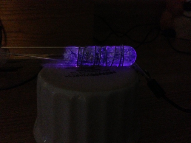 I plan to place this tube into a larger glass vessel and use an air pump to circulate air through it and have a dilute source of ozone. This test alone gave me a horrid sore throat the next morning... which I am directly blaming having my face too close to the damned thing for so long. Nonetheless.