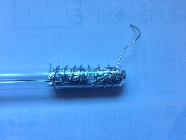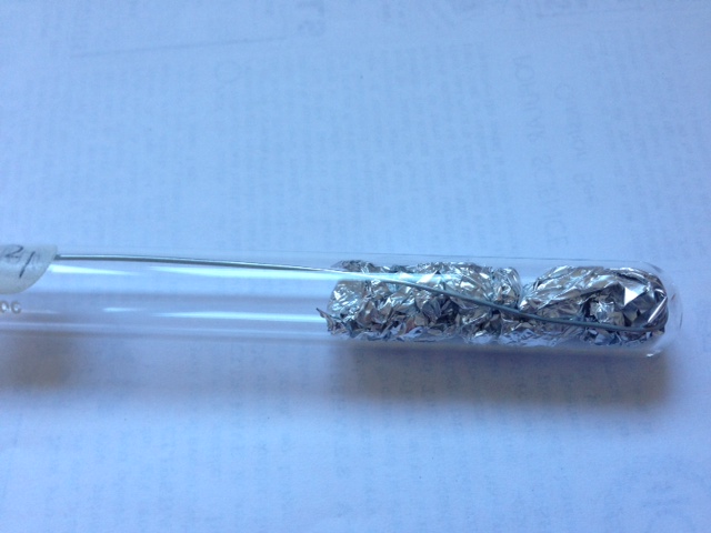 First a metal wire with a hook with roughly the same curve as the test tube bottom was stuck into the tube. Then aluminum foil was jammed in in small pieces and compacted quite a bit with a metal rod. This forms one electrode.