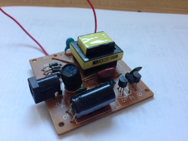 At first I tried to use this small transformer chip that came from a small neon tube display... It produced no glow or ozone. Im not sure what voltage these things operate at but obviously not high enough. The output wires do arc though and give nasty little shocks.