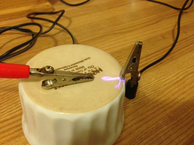 This is just running the coil with alligator clips on a porcelain dish...