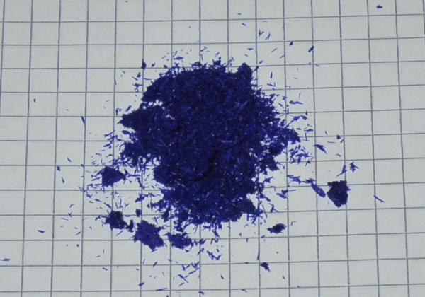 small, lustrous, sharp violet prisms. Crystalls are filtered off, washed with small ammount of ice cold water and dried at room temperature. Yield is