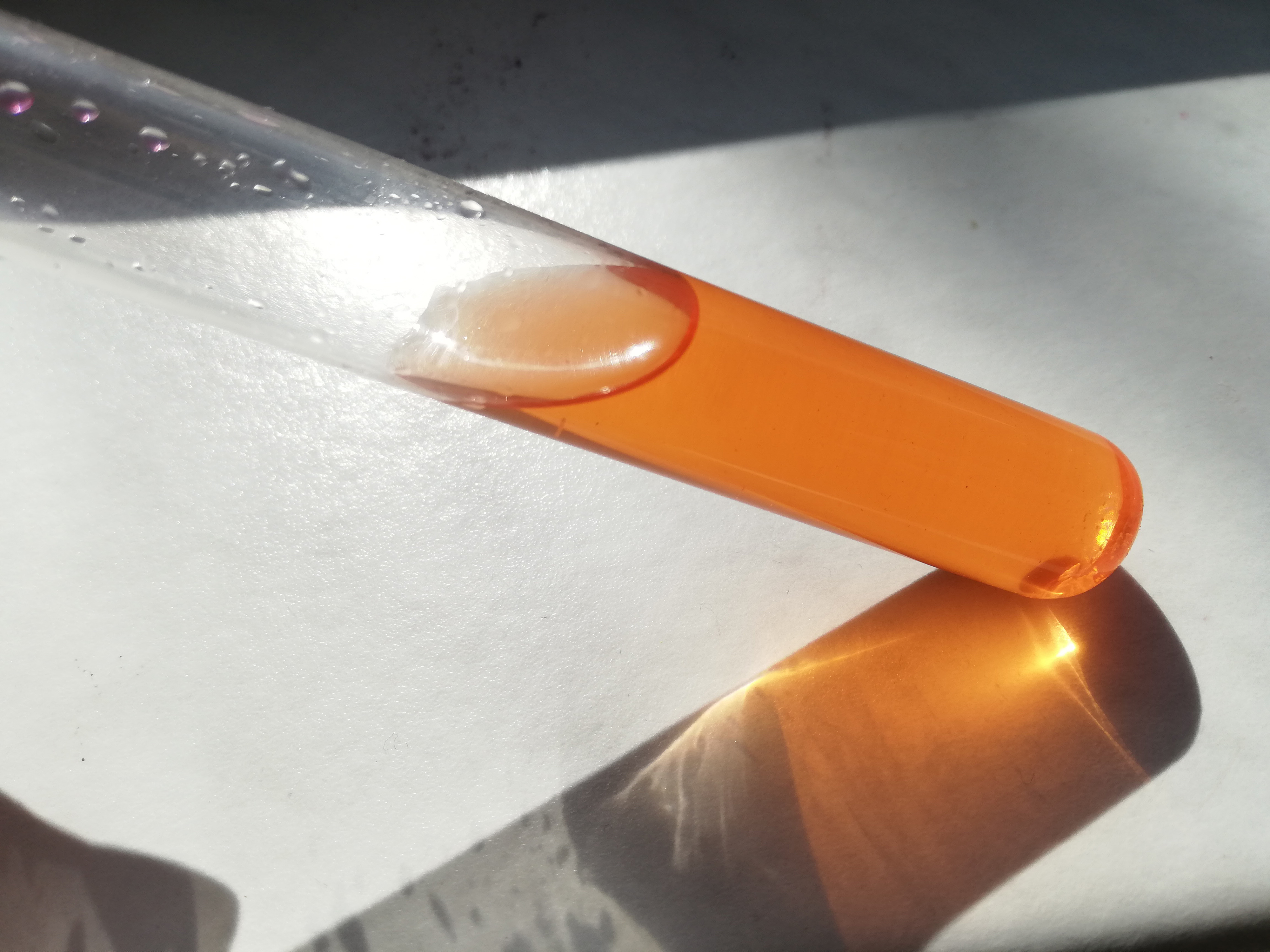 on top of that is a pink acidic layer. On shaking all of the liquid, the final color becomes red with an orange hue, just like the solution, obtained