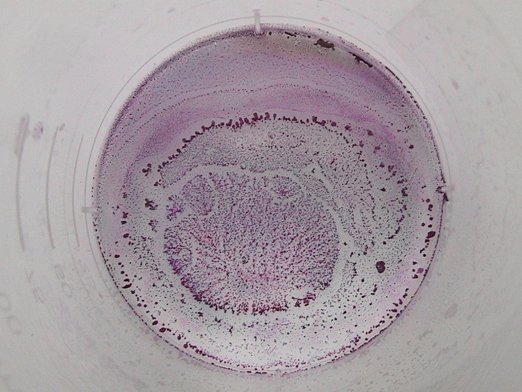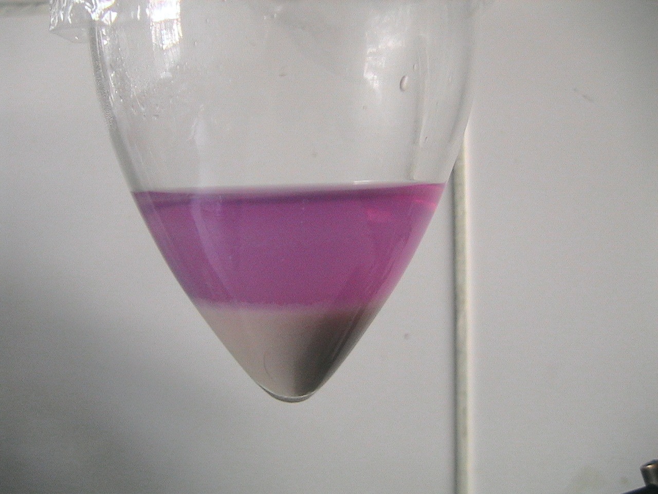 dissolves, producing a lot of heat. At the lower, strongly alkaline layer, the liquid becomes orange, then there is a very dark purple/blue layer and