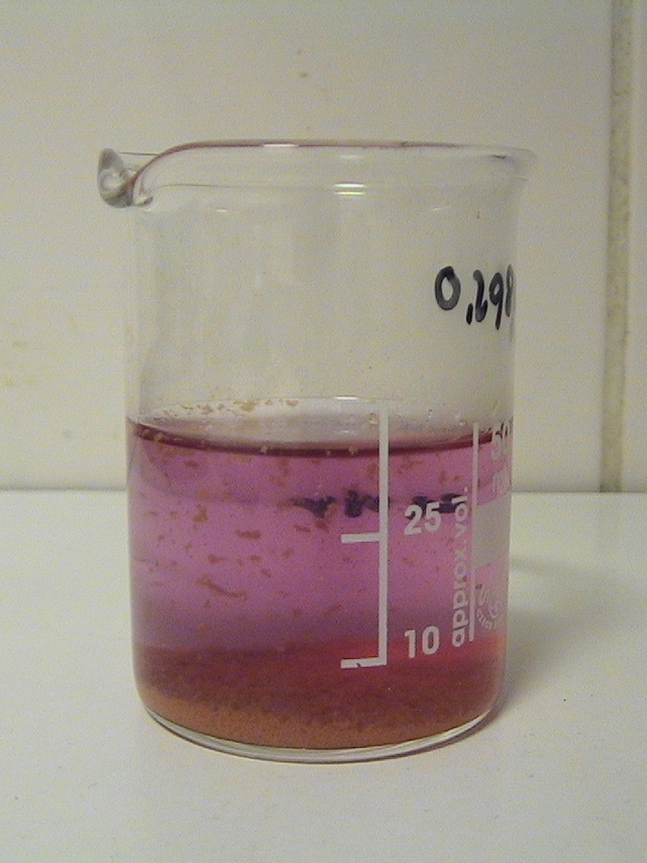 - Adding the solid to 10% H2SO4 leads to the solid turning orange/red instead of the bright purple/red and it dissolves, giving a colorless solution.