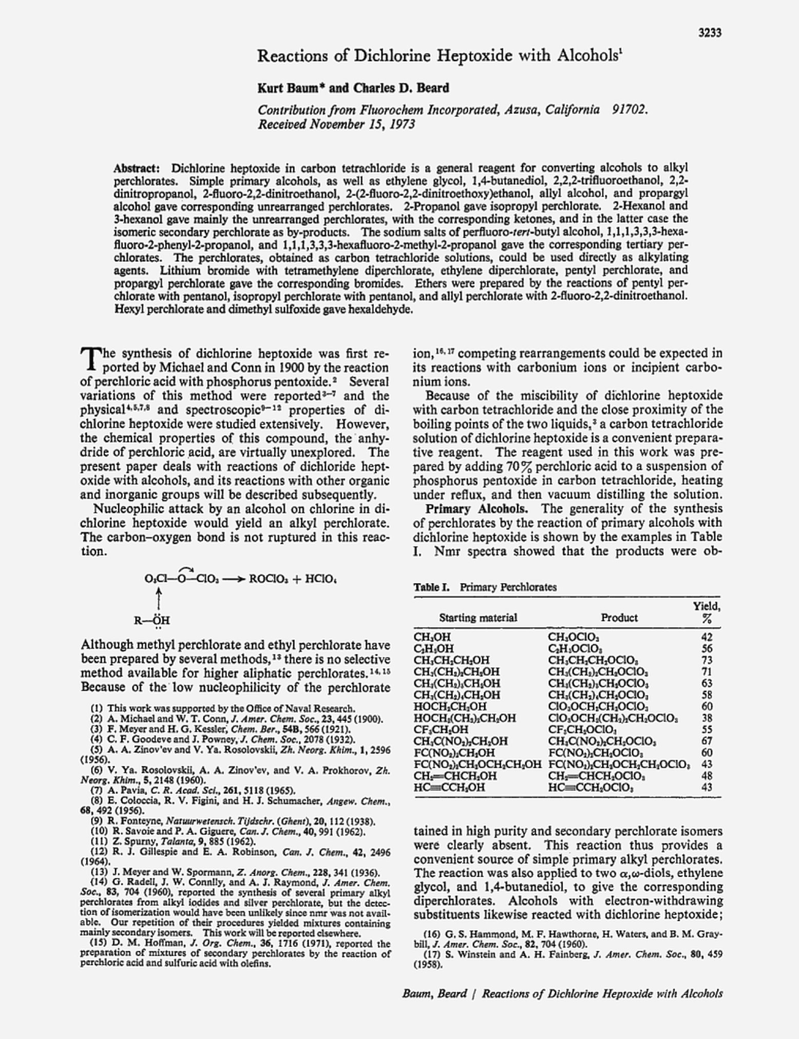 Dichlorine Heptoxide in Carbon Tetrachloride is a general reagent for the facile oxidation of alcohols to alkyl perchlorates.