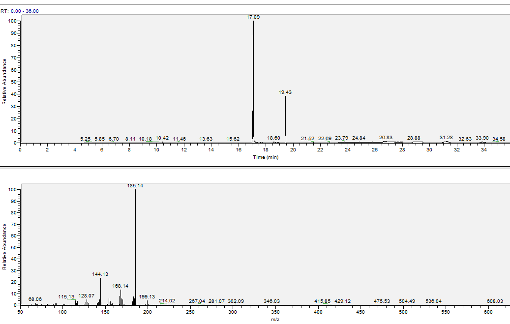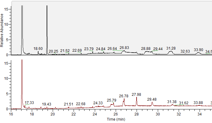 I used GC-MS. DB5 column, 30m x 0.25 mm, program 40-300 @ 10C/min, split-less injection, ion trap. Sample dissolved in EtOH.