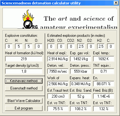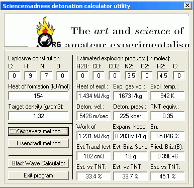 Guessing ∆Hf to be + 154 kJ/mol and entering into Engager's Detonation Calculator Utility