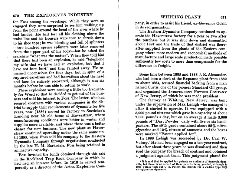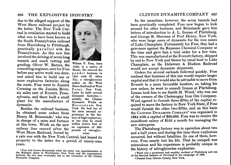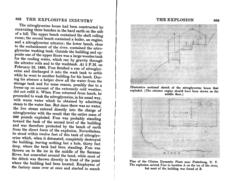 "Compare our next nitroglycerine incident. In 1886 Mr. Wilson P. Foss was manager of the Clinton Dynamite Company's plant at Plattsburgh, New York. He