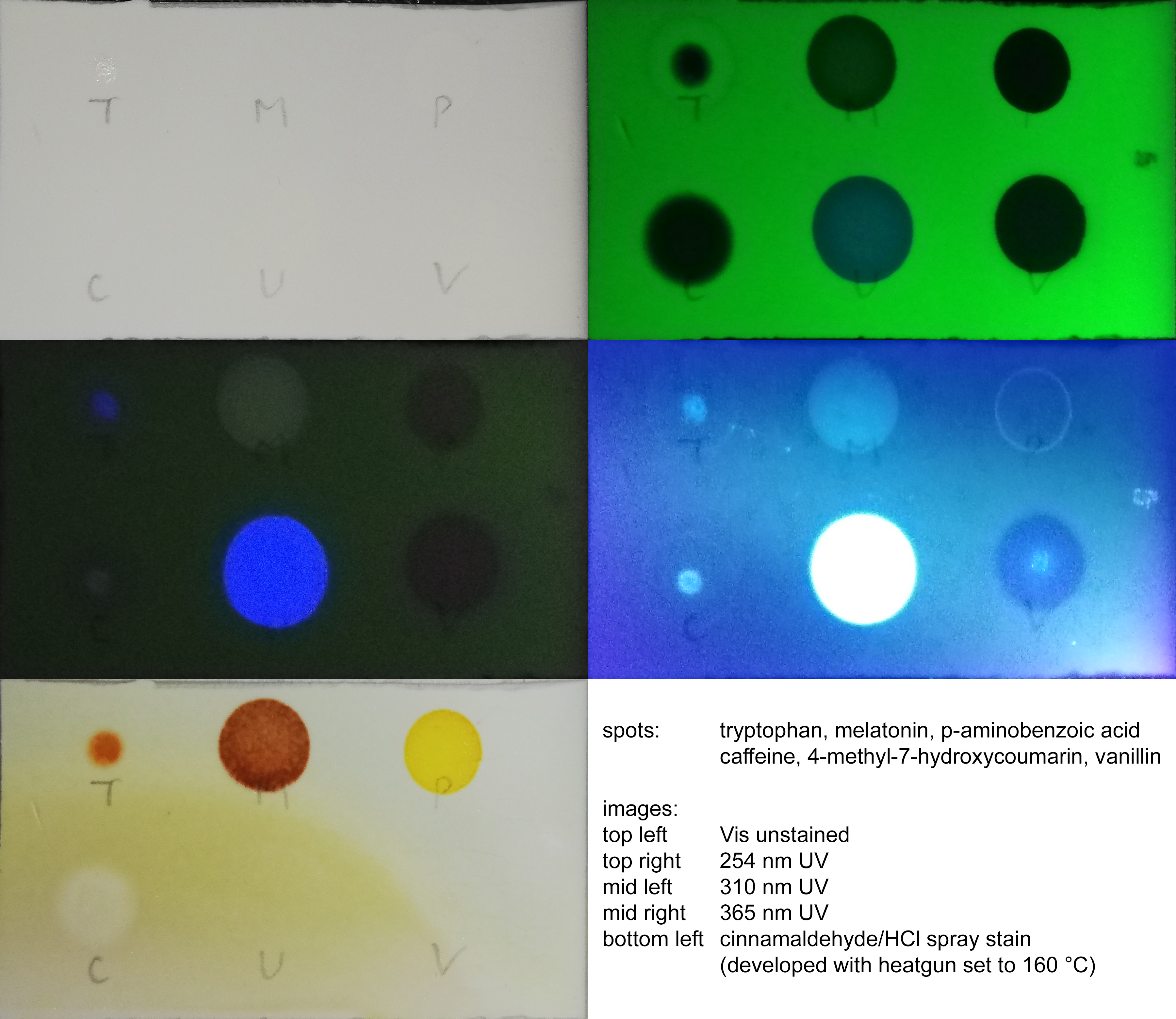 To test the stain, six samples were spotted onto a TLC plate: tryptophan, melatonin, p-aminobenzoic acid, caffeine, 7-hydroxy-4-methylcoumarine and