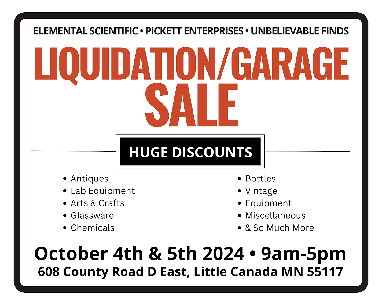 sale at our warehouse in Minnesota. Obviously, there will be lots of lab supplies, equipment, and chemicals, as well as household items and other