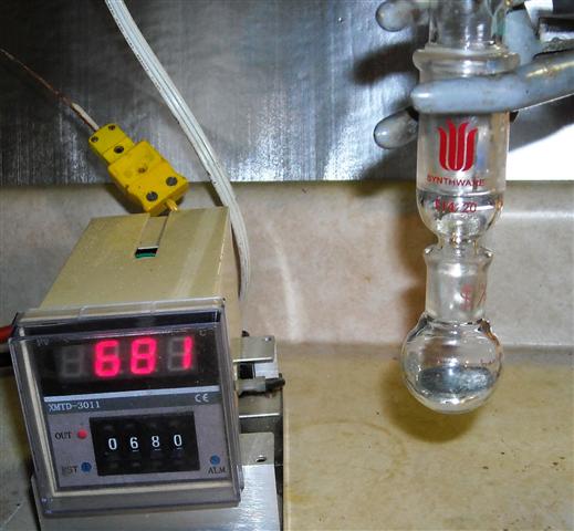 was observed yet. I decided to hold @ 650 C and after 10 - 15 minutes metal started distilling over. Over the next 1.5 hours, a total of 8.9 g (50%)