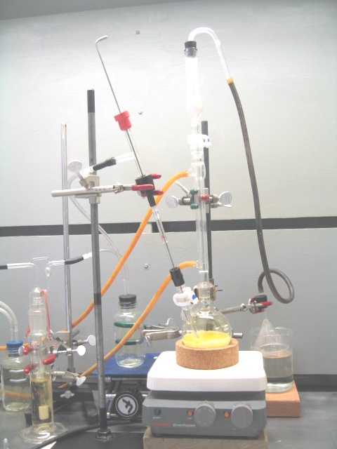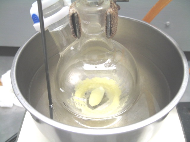 I started this experiment back in April but had to suspend it due to plugging of the sparge tube. So, I just placed the 2-neck RBF containing the P