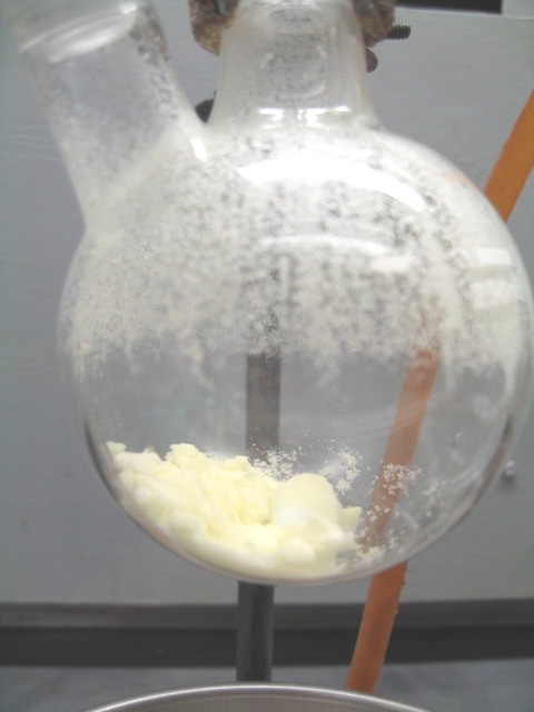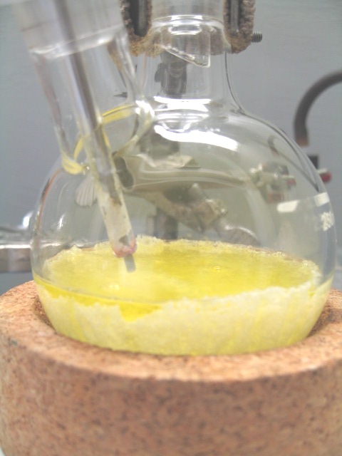 slush to vacuum distillation at 177mmHg until I saw what likely was sublimation on the RBF walls. 1.2mL of solvent came over.