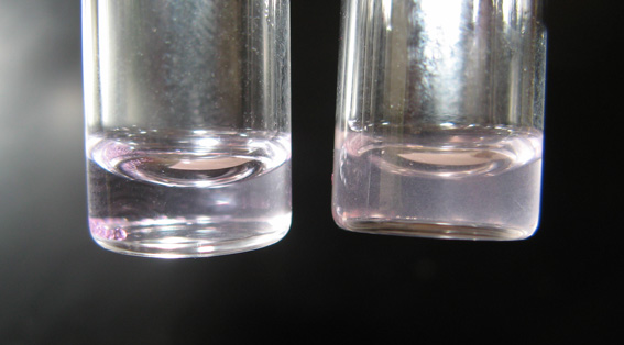 and a seemingly clear solution. The purple solution did not yield a visible pellet and appears unchanged.The two faintly purple solutions now look