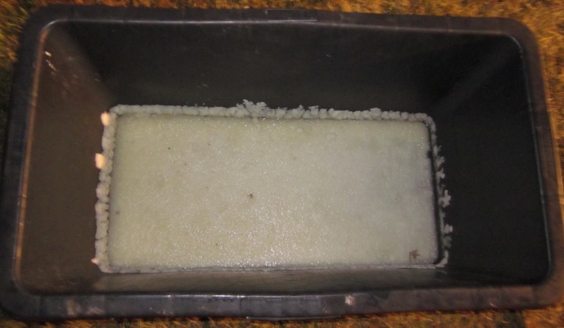 about 6-7 liters can be detected. Some of the contents have begun to crystallize on the pool, as can be noted on the picture.
