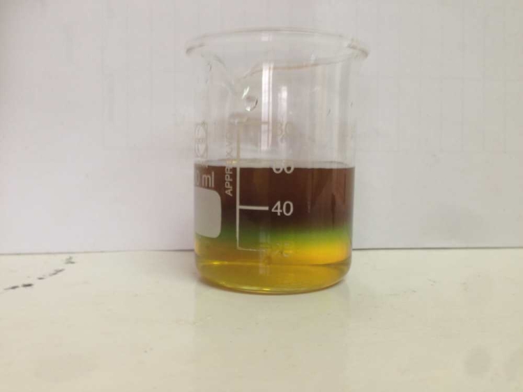 After taking a small sample of the brown liquor, and adding some 12.5% hypochlorite, the attached layering effect was encountered, with the quite