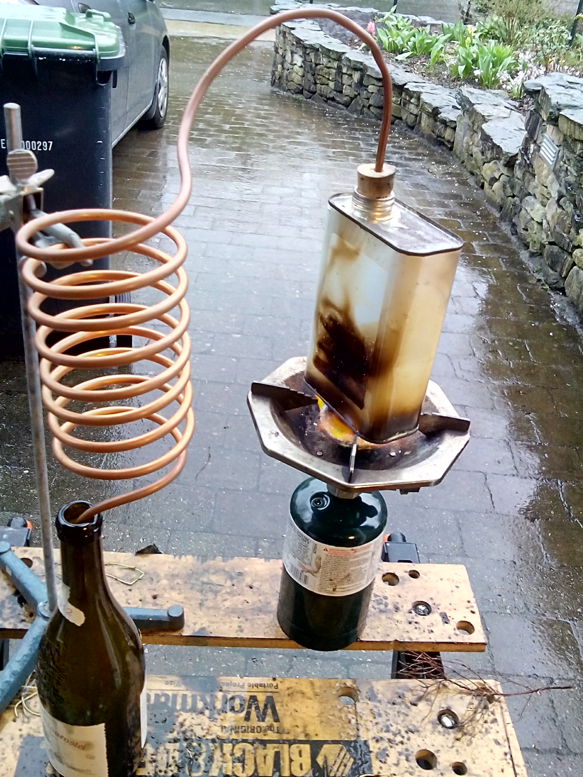 Here are some results (with photos) of my attempts to get Methanol from wood. I cut up an old evergreen stump, put them in an improvised setup, and