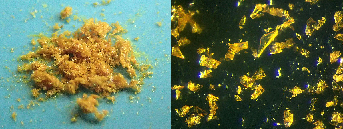 potassium nitrate. It separates on strong cooling as yellow/orange triangular shaped plates that were incredibly static, jumping around under the