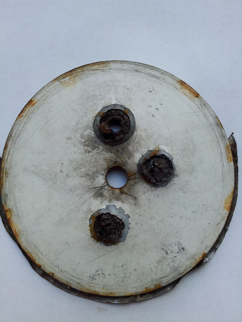 The hole on the right, in both witness plate shots, is from this test. The witness plate is the same beat up 3mm thick steel hole saw disc from the