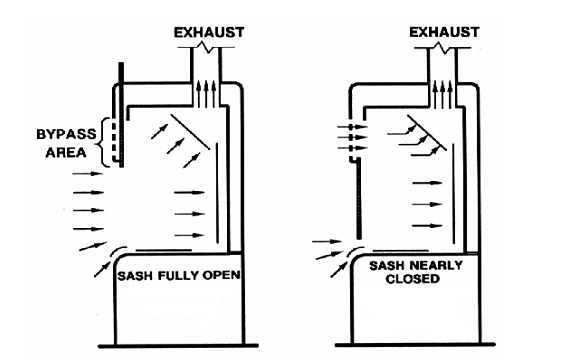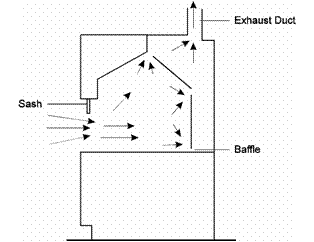 Here are a couple of images showing the preferred draft pattern in a fume hood. You can exhaust out the top or back, but you should have a back-baffle