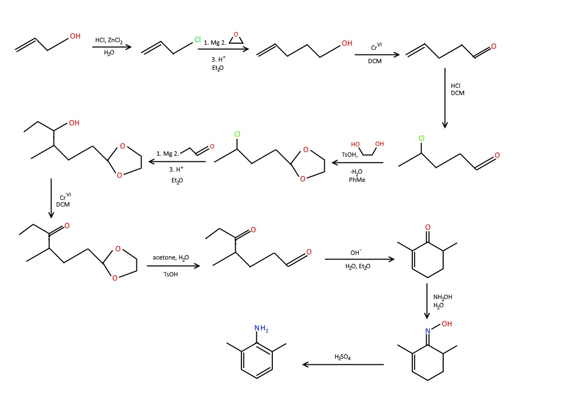 I'll post pictures required reactions soon. Right now I can just say the carbon skeleton will be made from allyl alcohol, ethylene oxide and propanal.