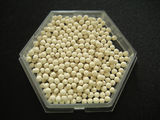 Molecular sieves are generally white to off-white spheres, though they also come in the form of cylinders, of various sizes, though the most common type has a diameter or 2-3 mm. They are made of various materials, such as zeolite, or natural/synthetic clays. The size of the sieves is measured in Angstroms (Å). They will absorb water and other fluids from various liquids or air. This process is reversible.