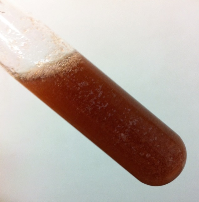 You can see some solid IBr at the bottom of the ampoule, the brown/pink vapor above it, and beautiful crystals at the bottom half of the ampoule.