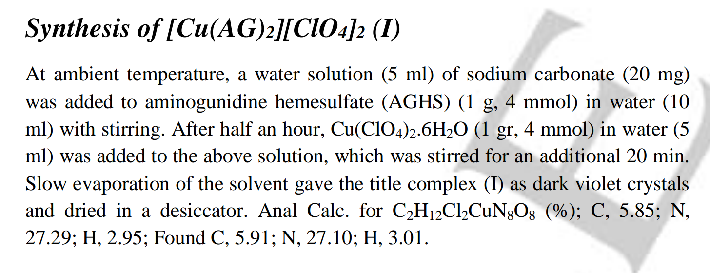 Just a heads up: The paper by Talawar et al on page 27 of this thread has some erroneous numbers in the synthesis description. The ratio of nickel to carbohydrazide is given as 0.07 mol to 0.02 mol. In would make sense if these numbers were simply reversed, but the masses are also wrong (and also don't match the molar amounts either). I think it's obvious that you should go with a molar ratio of 1 Ni to 3-4 CHZ and 2 ClO4, but just wanted to point this out to anyone wanting to replicate the work.