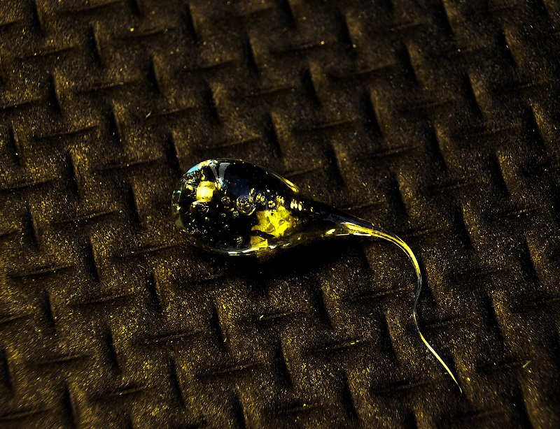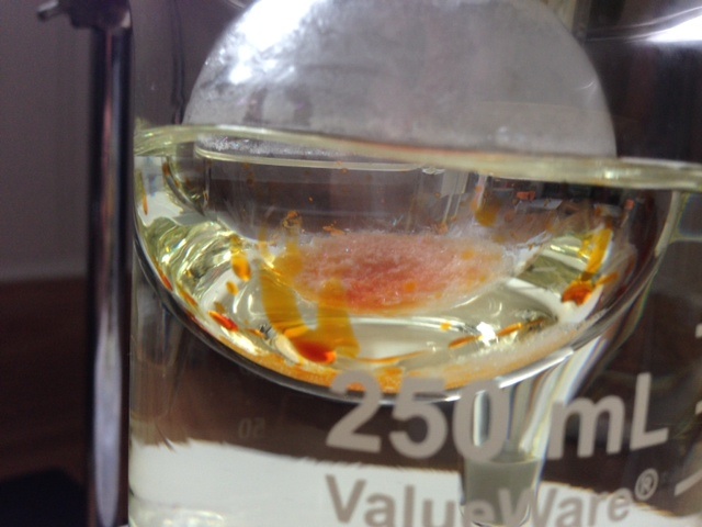 Everything is stored under mineral oil. I suspect since the small jar is opened more frequently, more oxygen gets in and reacts.