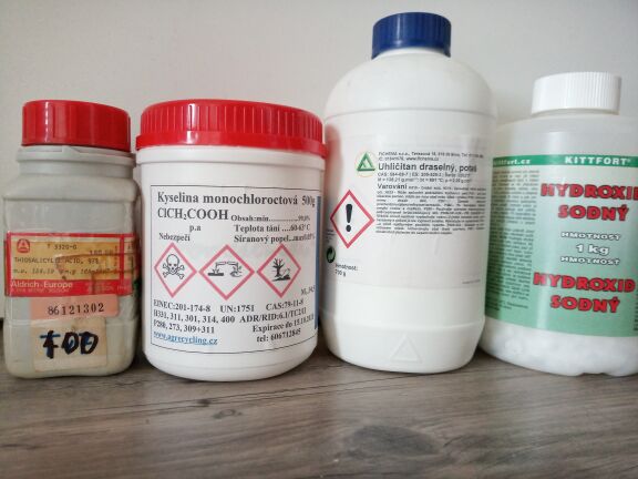 CO2). Excess of hydroxide was not used as it could dechlorinate chloroacetate, so K2CO3 was used. Also Na2CO3 could be used but I had a lot of K2CO3