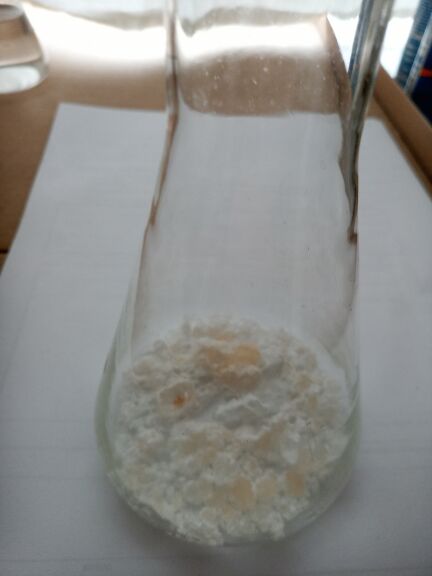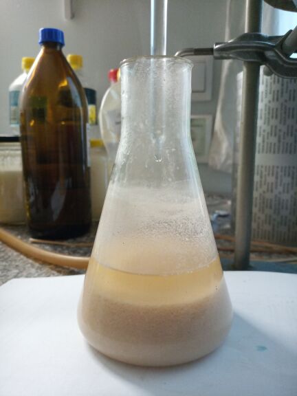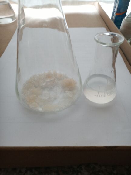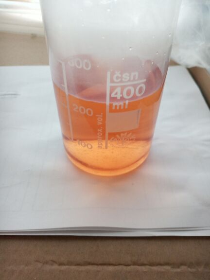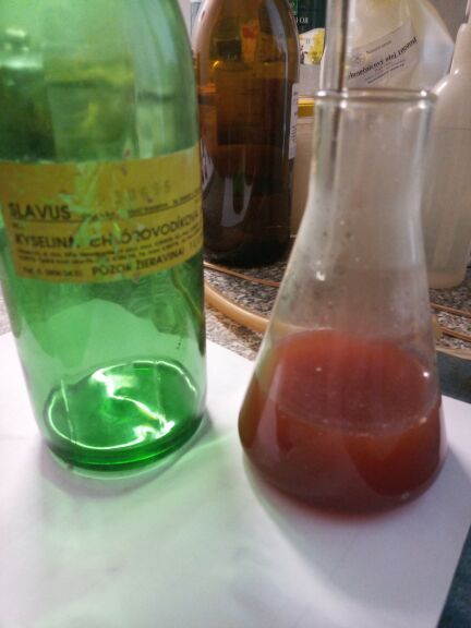 added totally, the solid product in flask had visibly paler color than the first crop. 22 ml of HCl added totally (0,25 mol, slight excess). Could