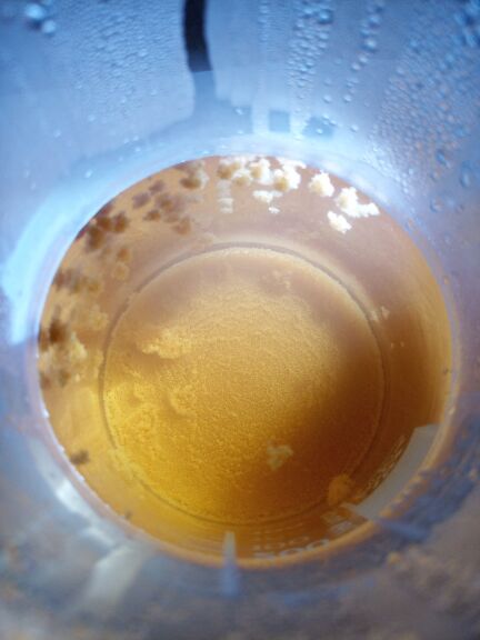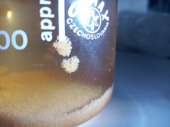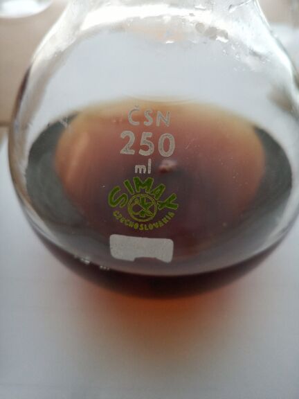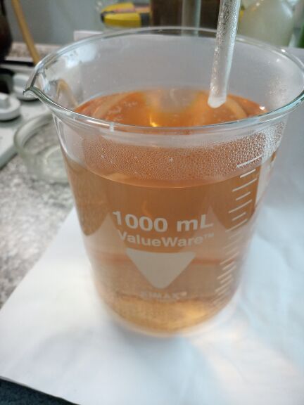 Dry in air the second crop (paler) for 3 days. Weight 13,0 g. Dissolve it in 900 ml of boiling water. Maybe slightly less water could be used 600-750