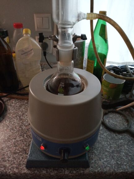 the flask in hand, add boiling stones (5 glass balls used), attach reflux condenser and reflux for 4 hours. Then add 1,0 g of activated charcoal and