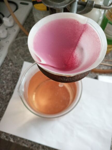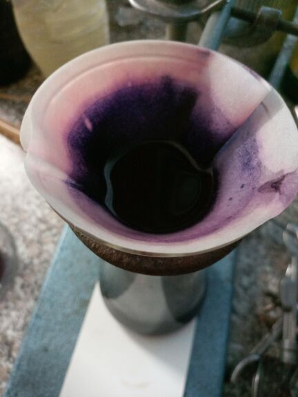 Gravity filter. Solid captured on filter paper had a violet color while filtrate dark red.