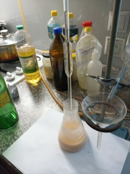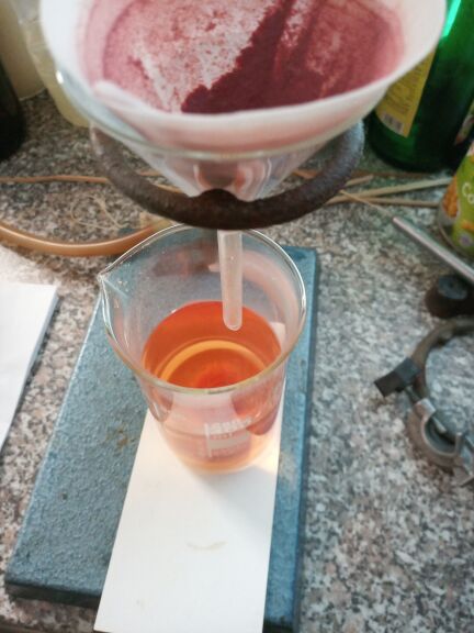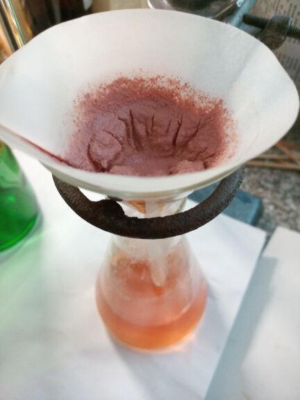 Gravity filter - a little of pink solid side-product stayed on filter paper while filtrate had salmon-orange or peach-orange color (I'm not good in