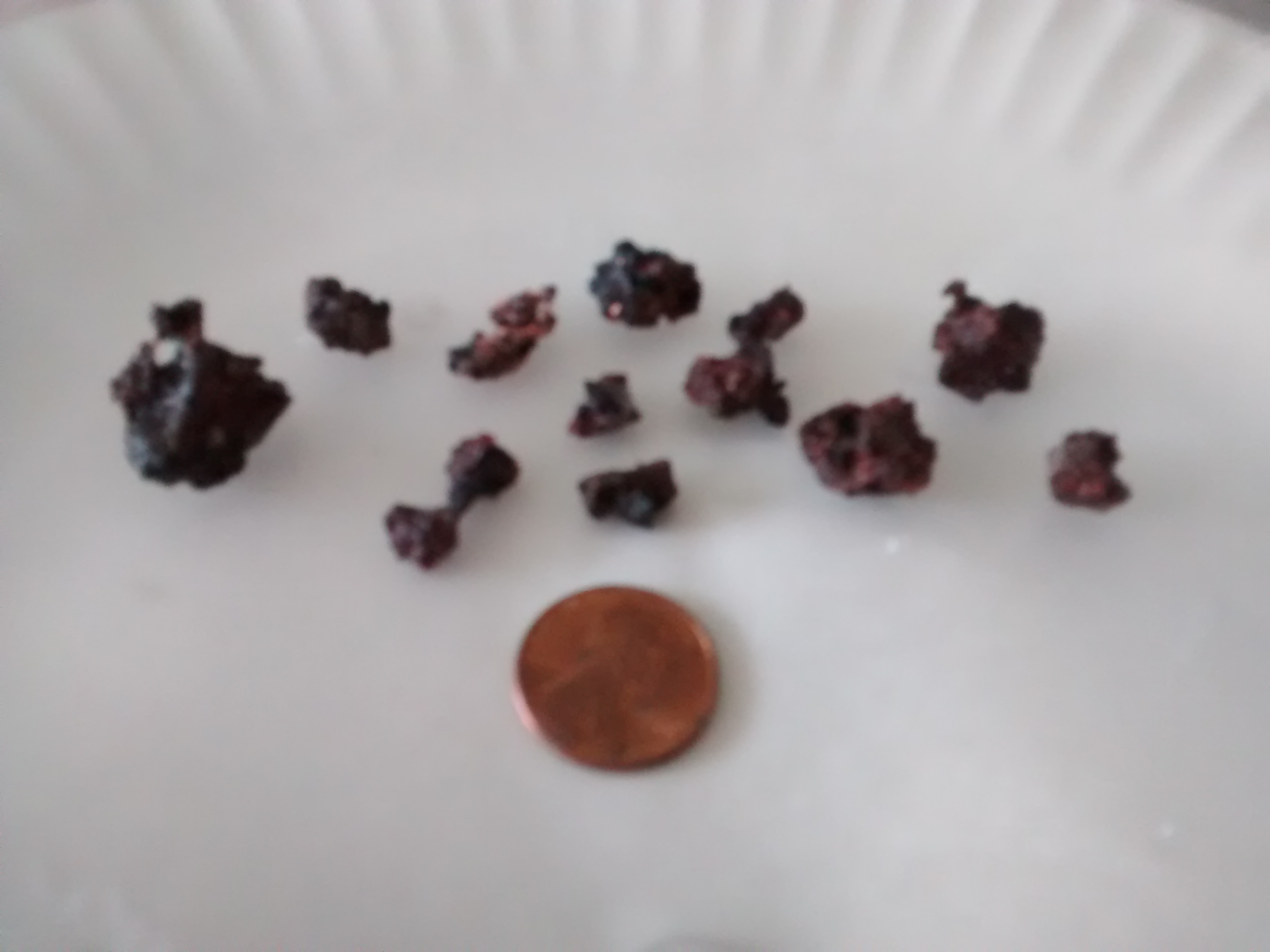 It looks more coppery in person; I'd estimate this crap is around half copper, and looks somewhat similar to some native copper I've seen. The image shows the slag after washing in water. The mixture was ignited atop a bed of bentonite granules (cat litter),