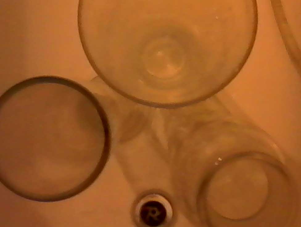 1. With tubing or bottles/flasks, if you hold the bottle up to the light above you, so that the walls of the bottle are seen along your line of sight,
