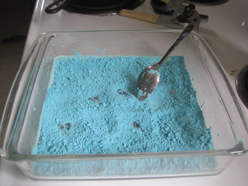 searched, but couldn't seem to find my old copper precipitates. From what I remember, after drying the filter cake it formed a <u>dark blue