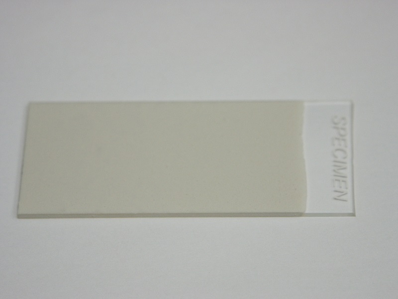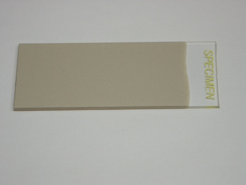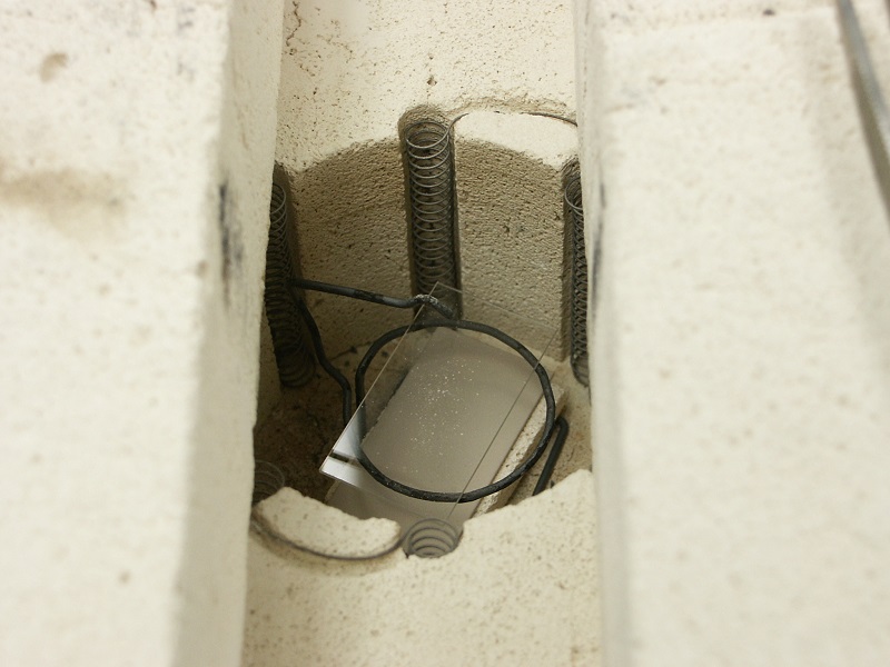 Once the slide has been coated (it will be dry almost as soon as you pull it out), it is fired in a kiln at 500°C for two minutes. In