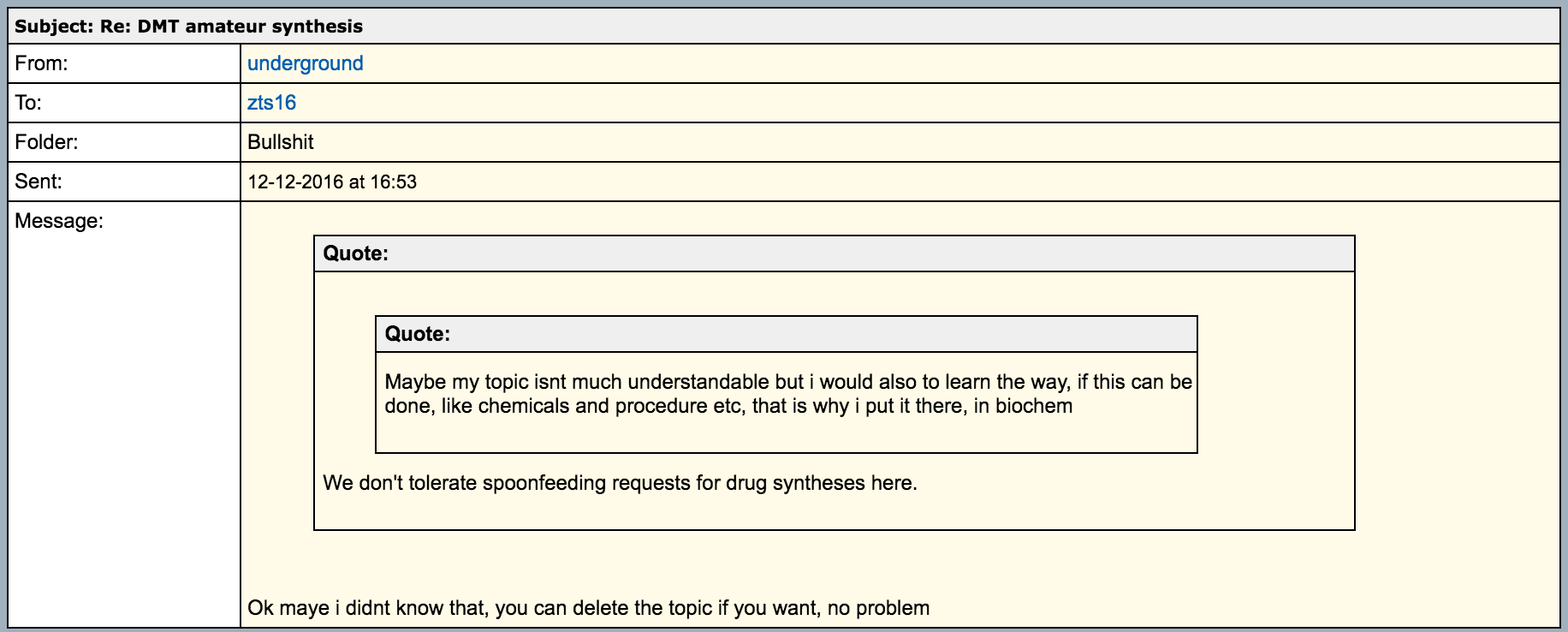 Message: it looks from your posts that you know a really good chemistry, so i would like to ask you if there is any way to make DMT from tryptophan
