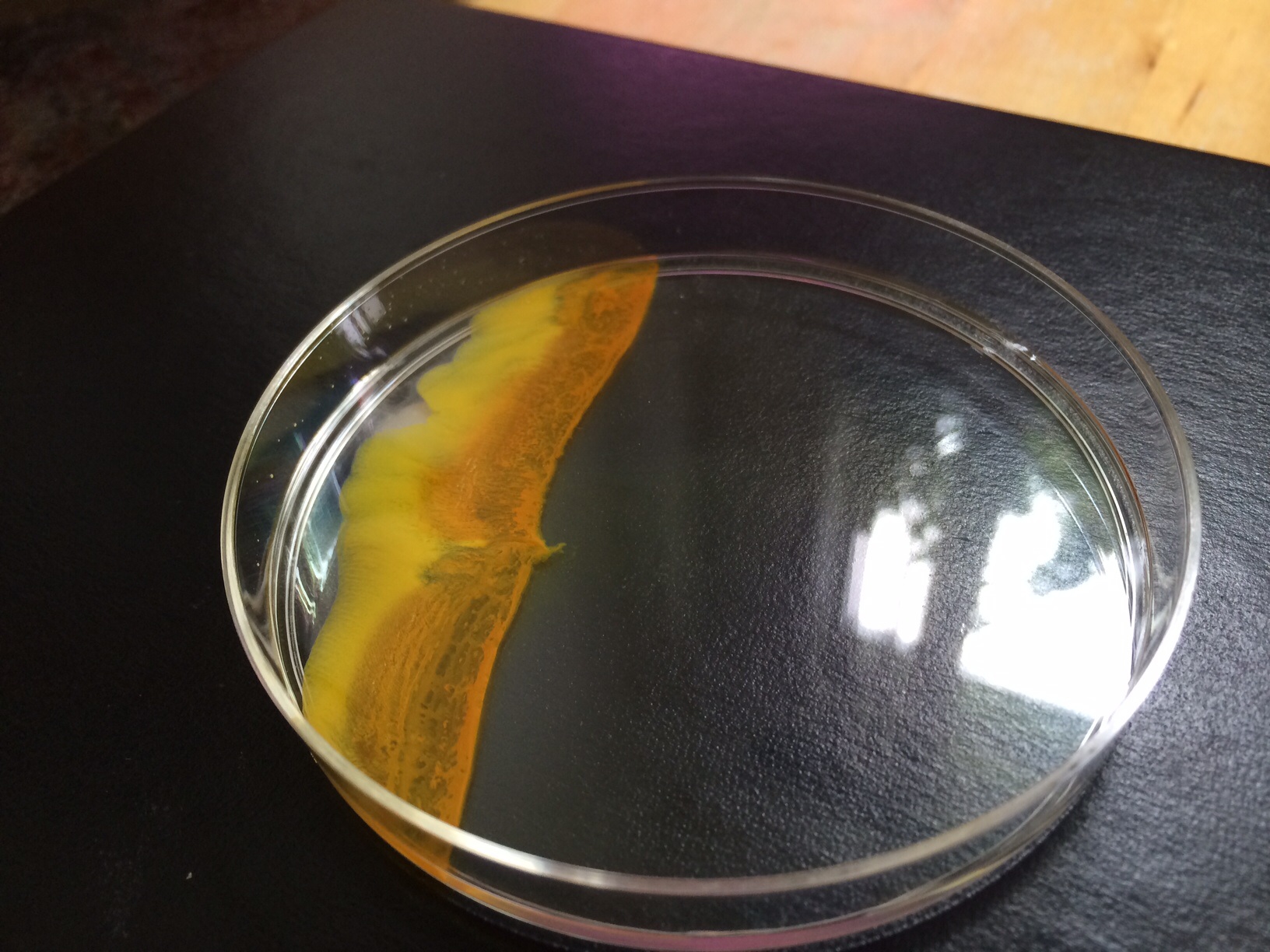 Cadmium sulfide- solid sodium sulfide was added to the right side of the dish, cadmium sulfate on the left. Such a pretty color