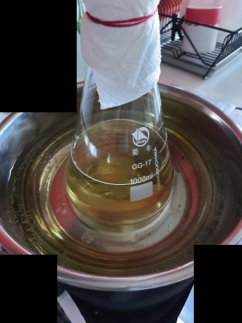Pic 5 heating in water bath after initial foaming died down; solution turned a darker shade with more foaming