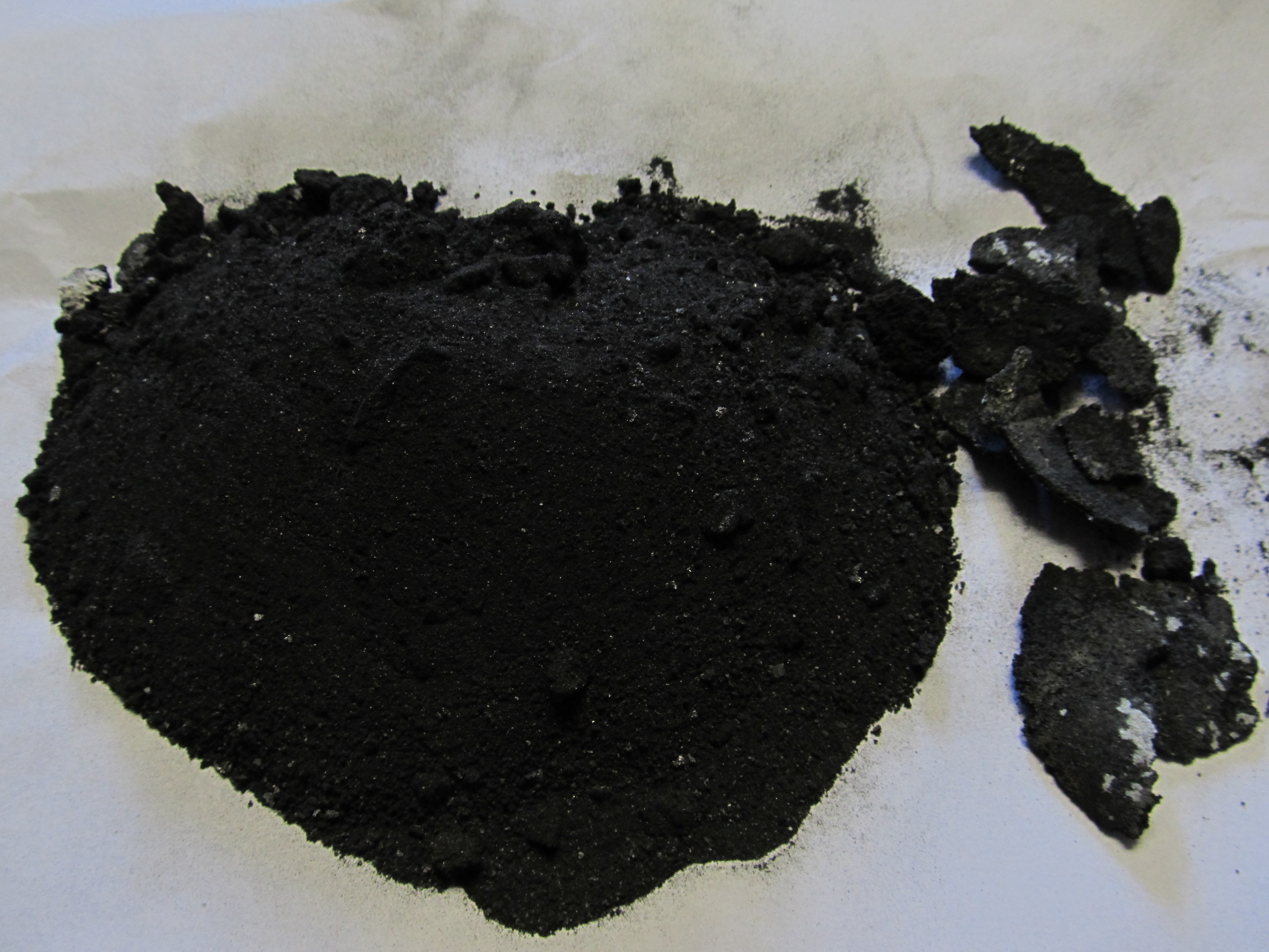 which I got from electrolysing copper pipes in tap water (I know, not very pure, but it has just enough ions to get the electrolysis started). Initially the source voltage was around 300V (From an inverter I made with 10 disposable camera flash circuits in parallel charging a 1200uF cap bank through rectifiers) then after enough copper ions had formed in the solution to allow the electrolysis to sustain itself I switched over to a 12V 15A power supply and let the electrolysis run for about 72 hours, replacing the anode occasionally and scraping as much of the basic copper carbonate into a separate container as I could manage. I later filtered the copper carbonated, air-dried it, and then heated it in a crucible at 600F until the green powder had turned uniformly black, and ground it using a mortar and pestle until it was a super-fine powder (it crushes like talc).