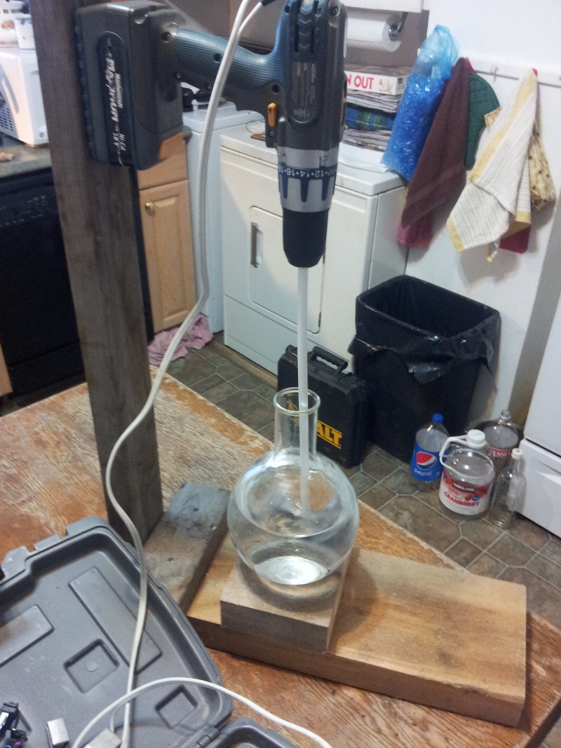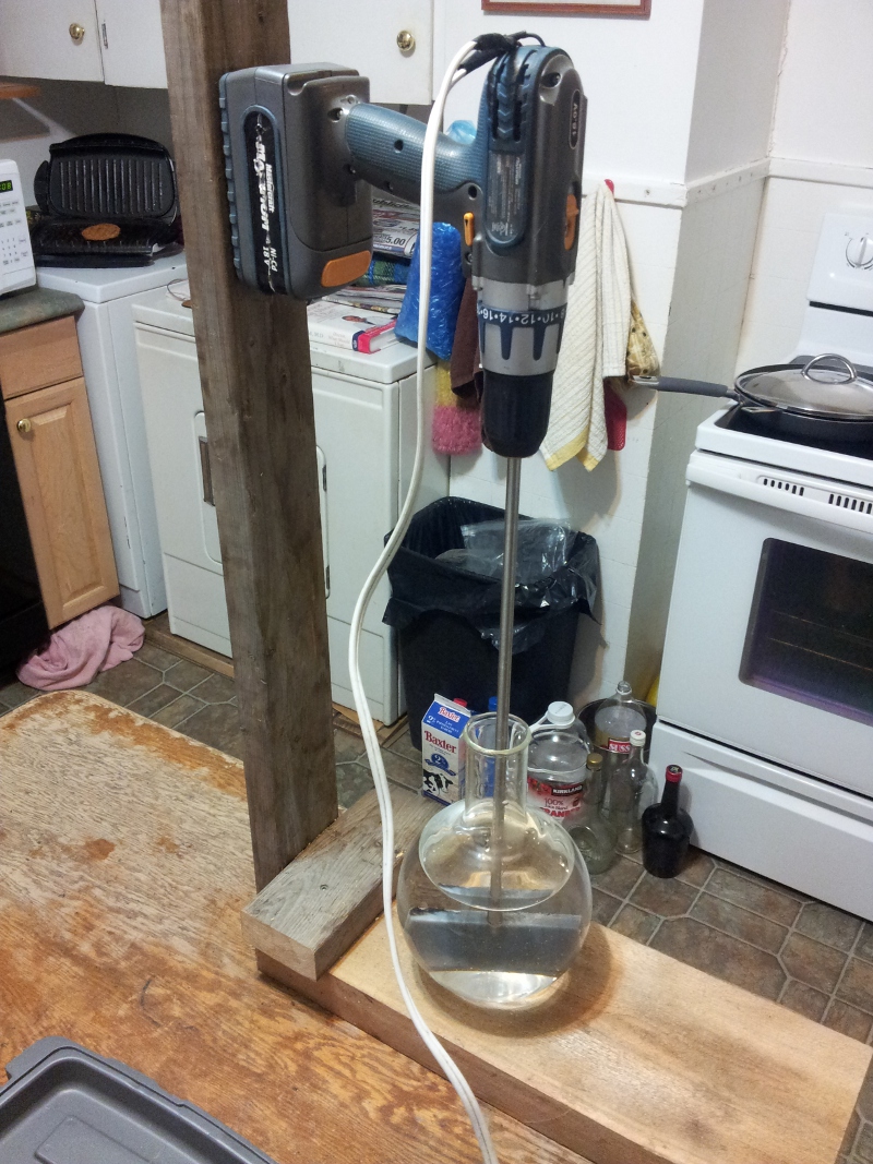 Do you have a drill press, by any chance? With the stirrer in the drill running at low speed, lower and lock it into place, and when you're done,