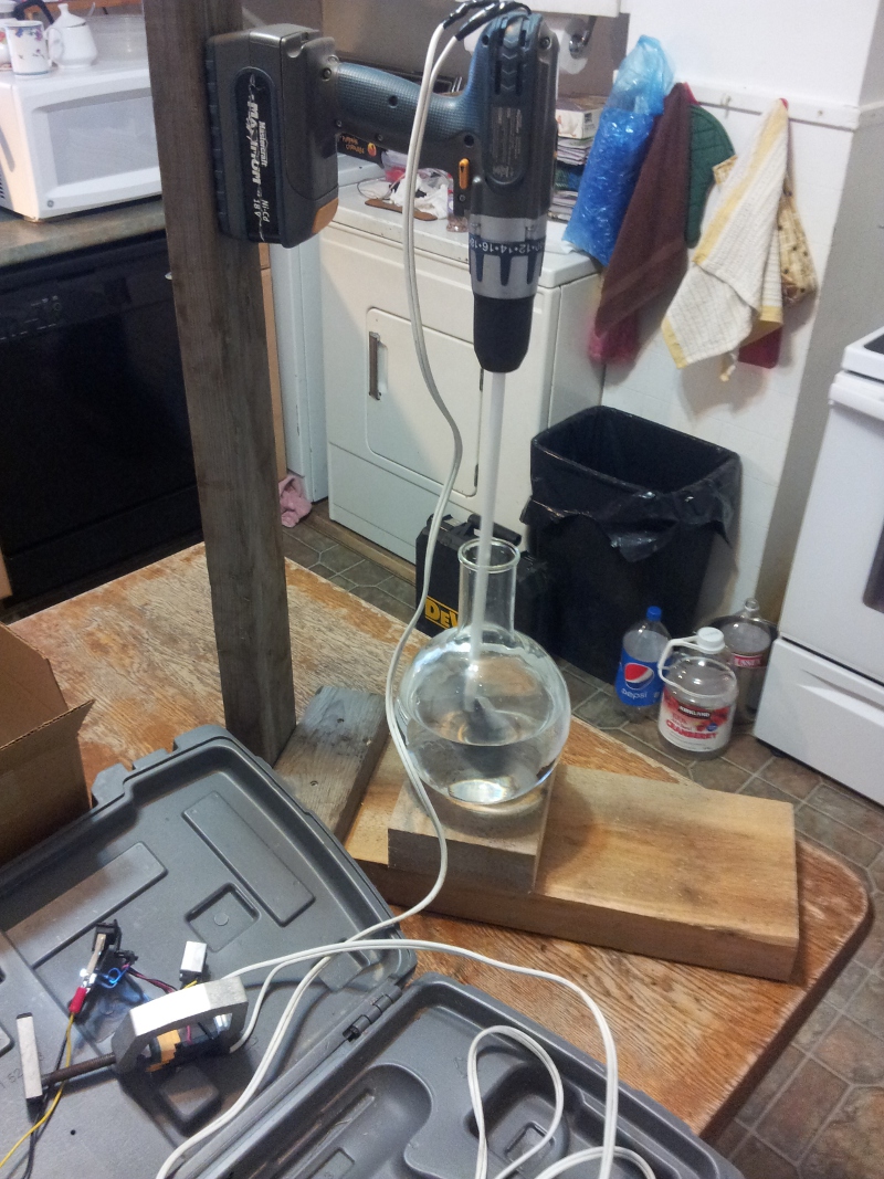 the stirrer stand; the drill can be easily attached and removed in this way. The drill is rated as 18V, but works fine from 12V providing all the